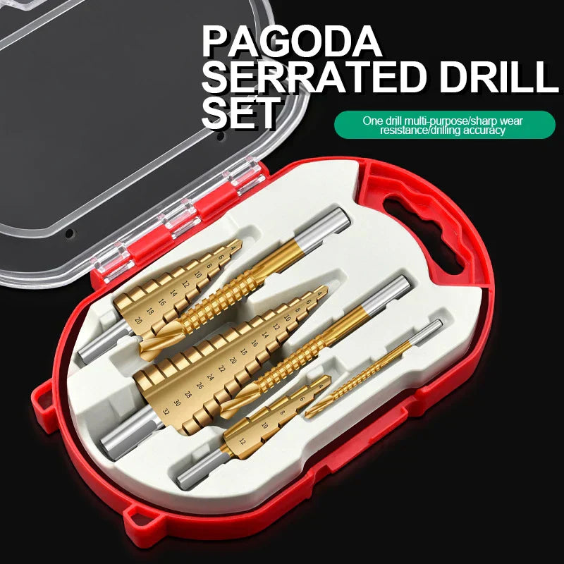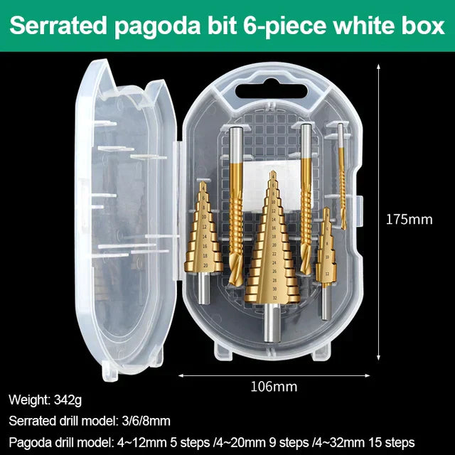 Mit neuester Technologie entwickelt, bieten diese Bohrer eine reibungslose Schneidleistung und verbessern die Perfektion Ihrer Industriegebäude. Das Set umfasst 3 Stufenbohrer und 3 gezahnte Bohrer, um verschiedene Anforderungen zu erfüllen und die Arbeitsleistung erheblich zu steigern. Die innovative Kombination aus Pagodenbohrer und gezahntem Bohrer erleichtert die Entfernung von Bohrabfällen, was zu schnellerem, präziserem und effizienterem Schneiden führt.
