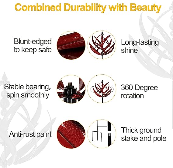 Sie brauchen keine komplizierten Installationen oder wartungsintensive Dekoration. Die LotusSpinner ist einfach aufzustellen und resistent gegen Rost, UV-Strahlen und Ausbleichen. Sie ist so gebaut, dass sie verschiedenen Wetterbedingungen standhält, damit Ihr Garten zu jeder Jahreszeit schön bleibt.