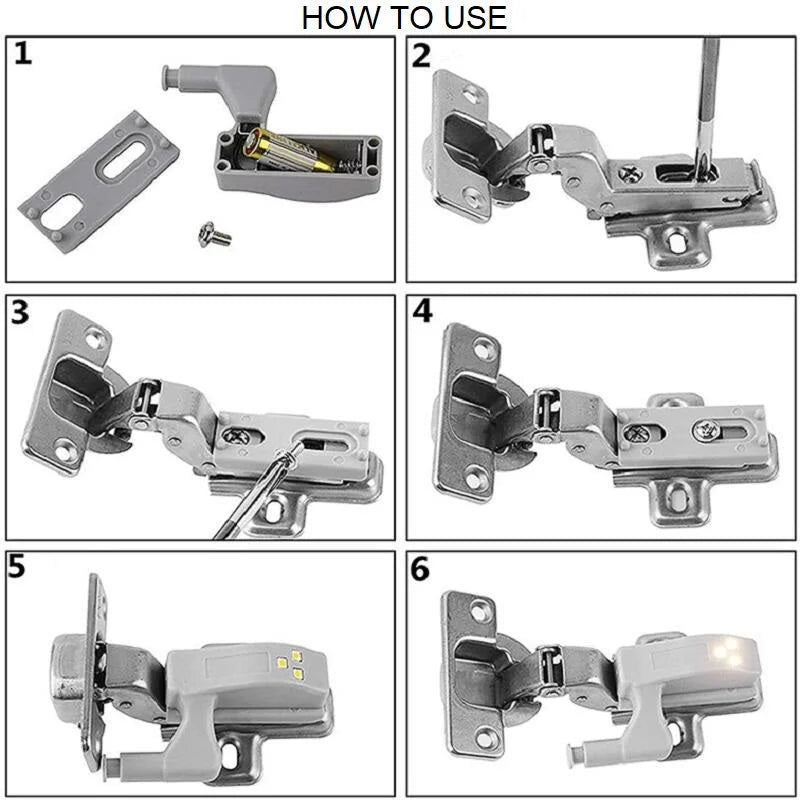 Die SchrankLights ist für Scharniere wie abgebildet geeignet, die Schraube im Scharnier muss herausgedreht werden und die Schraube kann entfernt werden, der Sockel der LED-Leuchte muss auf dem Schrankscharnier montiert werden. Bitte beachten Sie dieses Detail für den Fall, dass das Licht nicht für Sie funktioniert.
